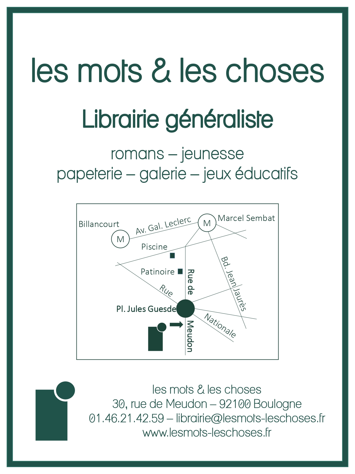 Vous trouverez dans les librairies les mots & les choses (dite « sud ») et les mots & les choses nord le nec plus ultra de la littérature, des polars, des essais, de la vie pratique et de la littérature Jeunesse ainsi qu’une offre large de jeux, jouets (Djeco, Janod,…), puzzles, loisirs créatifs et de papeterie (LEGAMI !). À la librairie les mots & les images, vous trouverez un trésor de 10.000 bandes dessinées et mangas, des jeux de société de 7 à 107 ans (puzzles adultes, skyjo, trio, cracklist, aventuriers du rail,…) et une sélection de papeterie japonaise